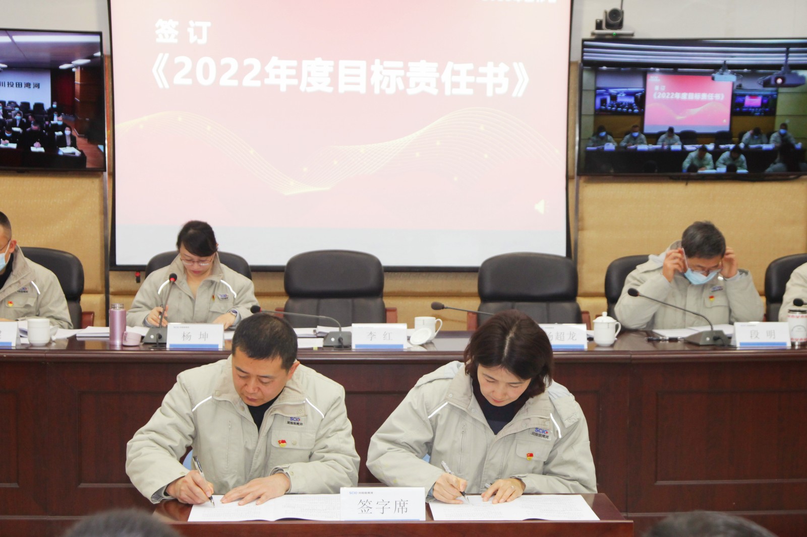 会上,李红与杨超龙签订了《2022年度目标责任书》,杨超龙代表班子与各部门(公司)主要负责人签订了《2022年度部门综合目标责任书》《2022年度部门安全环保目标责任书》。