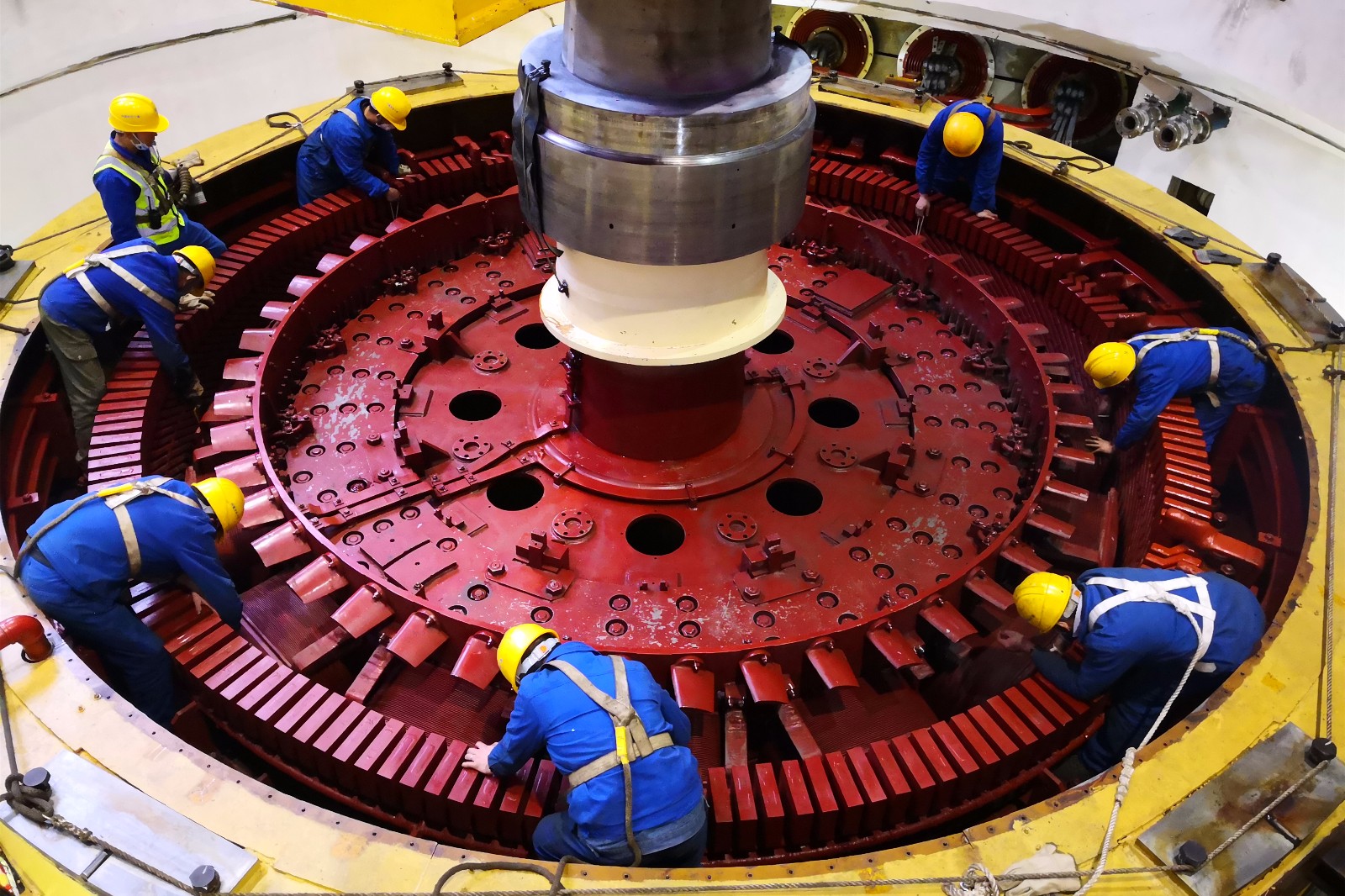 转子起吊前,监理组专业技术人员会同施工方对桥机进行了联合检查,对转子吊装的各项准备工作进行再次确认,确保转子具备吊装条件。下午15时,各项安全保障措施准备就绪,施工负责人向李红汇报各项准备工作并申请转子吊装作业。“仔细检查并做好各项安全监护工作,同意起吊!”李红铿锵有力地说道。经过近两个小时持续奋战,重约260吨的转子平稳地放在基坑内下机架上,随着起重总指挥的最后一声“停止”哨响,标志着金窝电站二号机组转子吊装工作顺利结束,金窝电站二号机组大修工作的又一关键性节点目标完成。同时,发电机导轴承改造、平钝喷针头技改等重点工作也正稳步推进。