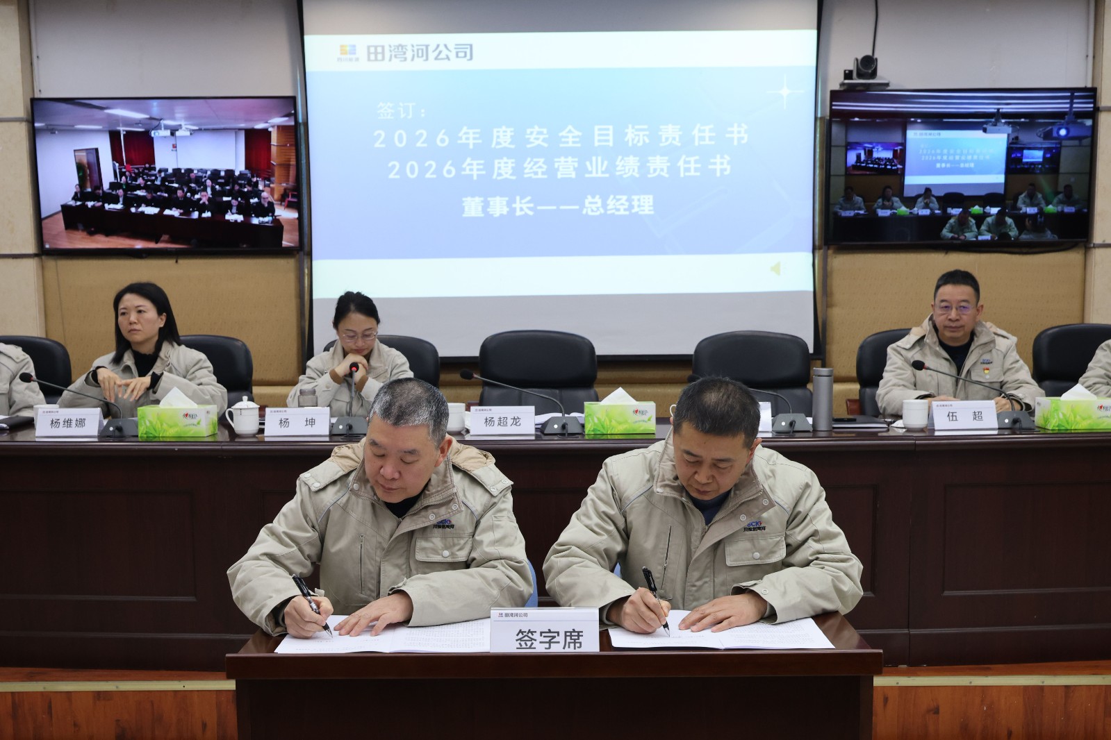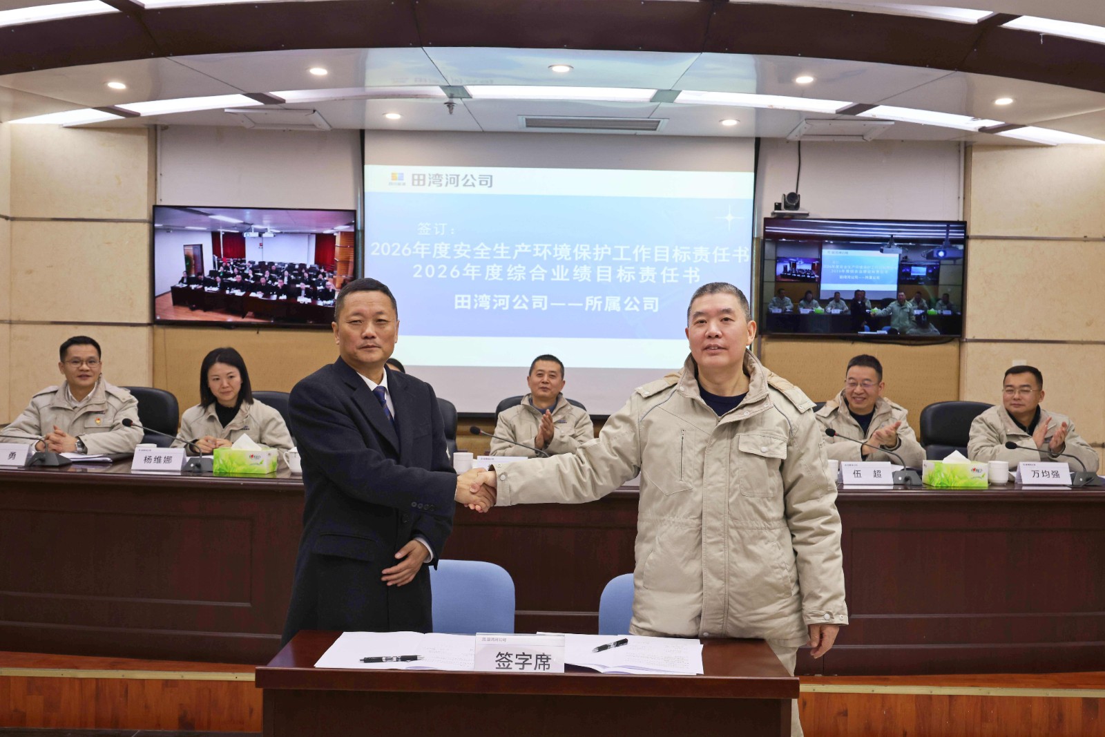 会上,杨超龙与陶世贤签订了年度安全目标责任书、经营业绩责任书,陶世贤与经营班子成员及部门、所属公司代表签订了年度安全目标责任书、综合业绩目标责任书,杨坤与部门、所属公司代表签订了年度信访稳定工作目标责任书。其余代表按管理层级签订了年度安全环保目标责任书。