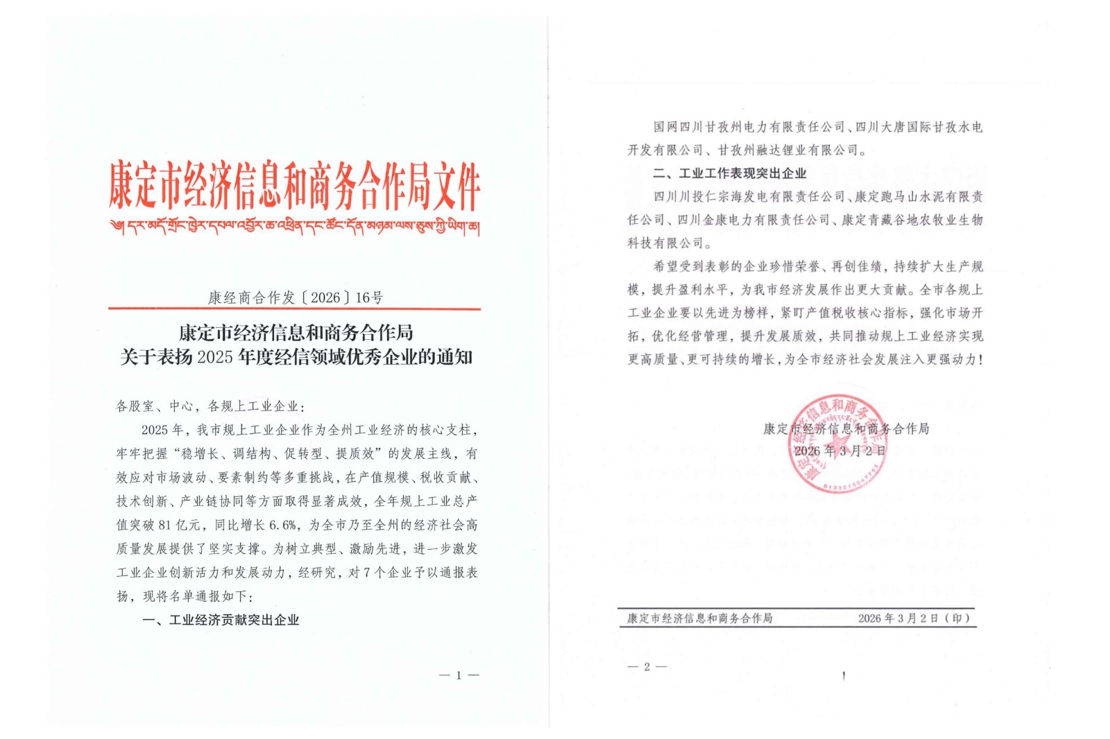 近日,田湾河公司所属仁宗海公司被康定市经济信息和商务合作局授予“工业工作表现突出企业”荣誉称号。这一殊荣不仅是对公司在工业领域主动担当、务实作为的高度肯定,更充分体现了公司在推动地方工业经济高质量发展中发挥的积极作用。